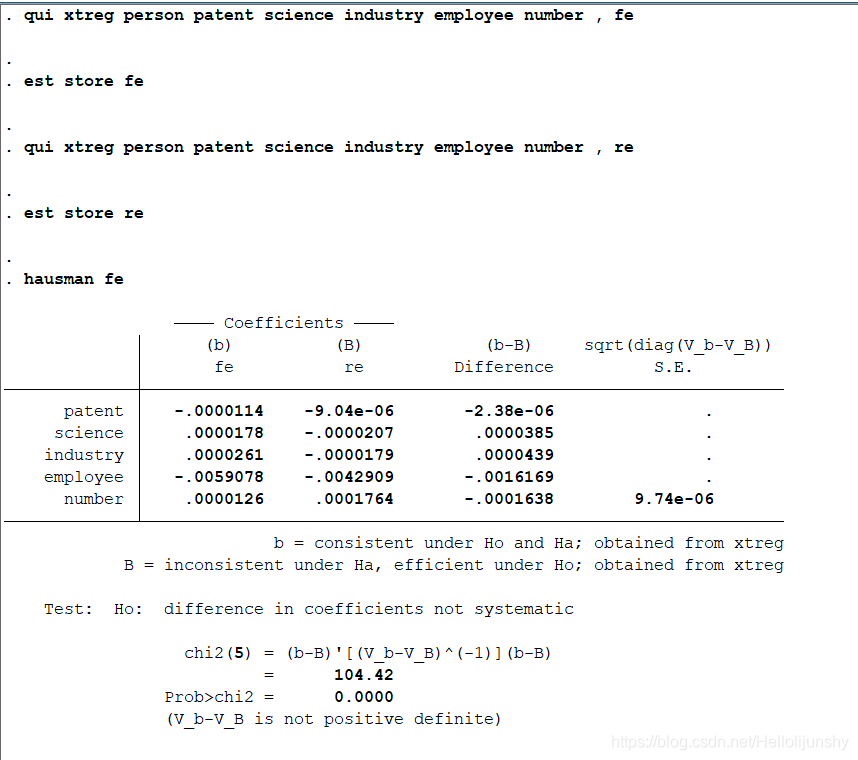 第一步:检验个体效应的显著性(混合效应还是固定效应好)(原假设:使用OLS混合模型)。执行命令:xtreg person patent science industry employee number,fe,刚才我们做固定效应模型时,F 检验表明固定效应模型优于混合 OLS 模型。下面我们说明如何检验随机效应是否显著,【建议做完第一步,直接做第三步hausman检验即可】