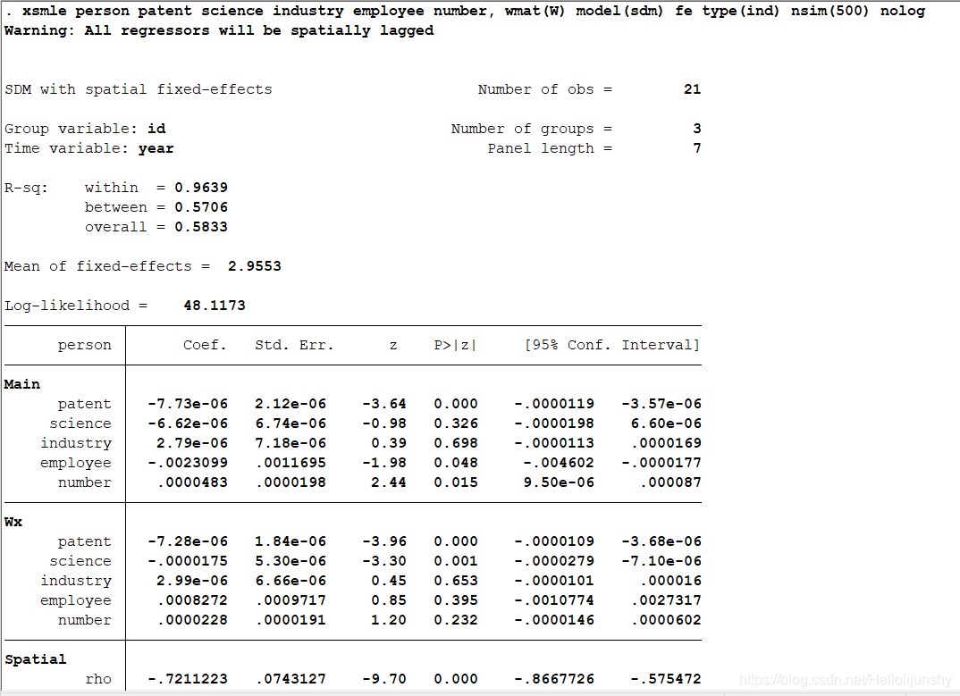Stata命令:xsmle person patent science industry employee number, wmat(W) model(sdm) fe type(ind) nsim(500) nolog effects