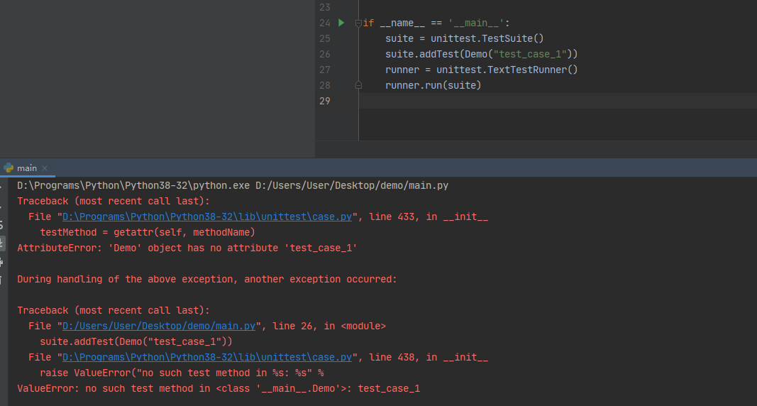 这是因为ddt为了防止方法名冲突,自动修改了方法名称。名称改变后,表面看起来也没影响用例的执行,这是因为我们使用的是自动搜索用例的方法执行的用例,如果使用addTest这种指定用例的方法就会报错:ValueError: no such test method in <class '__main__.Demo'>: test_case_1
