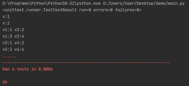 class Demo(unittest.TestCase):@ddt.data(1, 2) # 迭代的参数值def test_case_1(self, v): # 迭代的参数个数需要与方法中的形参个数一致print(f"v:{v}")@ddt.data((1, 2), [3, 4]) # 迭代的参数值类型可以为元组或列表@ddt.unpack # 当迭代的参数为多维数组时,需要使用该装饰器来解析参数def test_case_2(self, v1, v2):print(f"v1:{v1} v2:{v2}")@ddt.data({"v3": 1, "v4": 2, "case_name": "test_normal"}, {"v3": 3, "v4": 4, "case_name": "test_error"}) # 在数据中定义case_name的key,值就为用例名称@ddt.unpackdef test_case_3(self, v3, v4, case_name):print(f"v3:{v3} v4:{v4}")