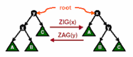 情况一:节点x的父节点y是根节点。这时,如果x是y的左孩子,我们进行一次Zig(右旋)操作;如果x 是y 的右孩子,则我们进行一次Zag(左旋)操作。经过旋转,x成为二叉查找树S的根节点,调整结束。即:如果当前结点父结点即为根结点,那么我们只需要进行一次简单旋转即可完成任务,我们称这种旋转为单旋转。如图1所示