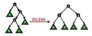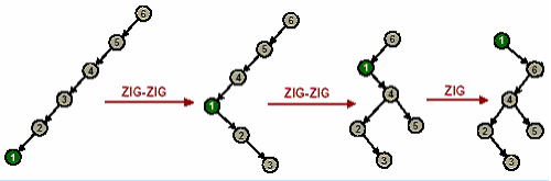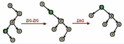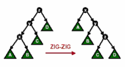 情况三:节点x的父节点y不是根节点,y的父节点为z,x与y中一个是其父节点的左孩子而另一个是其父节点的右孩子。这时,我们进行一次Zig-Zag操作或者Zag-Zig 操作。即:这时我们连续旋转两次X 。我们称这种旋转为之字形旋转。如图3所示