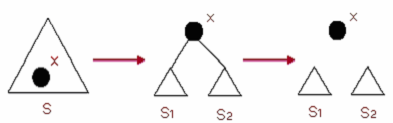 首先,用在二叉查找树中查找元素的方法找到x的位置。如果x没有孩子或只有一个孩子,那么直接将x删去,并通过Splay操作,将x节点的父节点调整