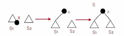 (4)Join(S1,S2):将两个伸展树S1与S2合并成为一个伸展树。其中S1的所有元素都小于S2的所有元素。首先,我们找到伸展树S1 中最大的一个元素x,再通过Splay(x,S1)将x 调整到伸展树S1 的根。然后再将S2 作为x 节点的右子树。这样,就得到了新的伸展树S。如图6所示