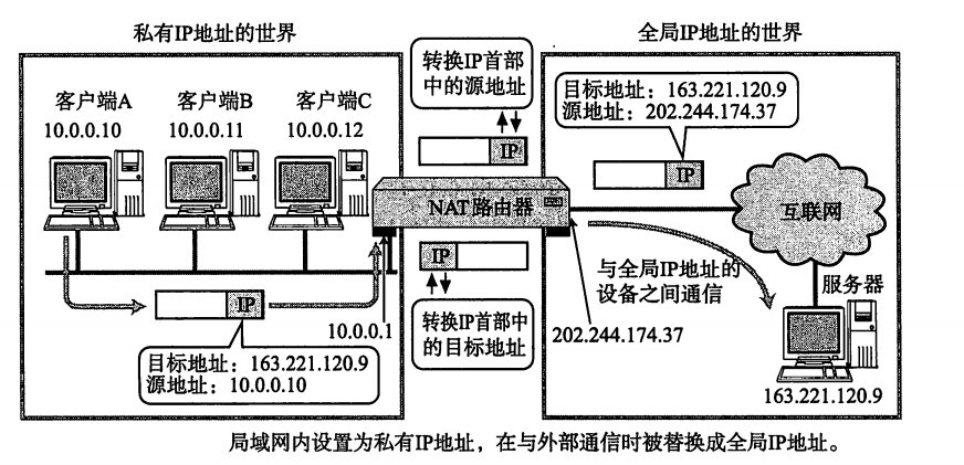 如下图所示,以10.0.0.10的主机与163.221.120.9的主机通信为例。利用NAT,将发送源地址从10.0.0.10转换为全局的IP地址202.224.174.37在发送数据。反之,当包从地址163.221.120.9发过来时,目标地址202.224.174.37先被转换成私有IP地址10.0.0.10以后在被转发。
