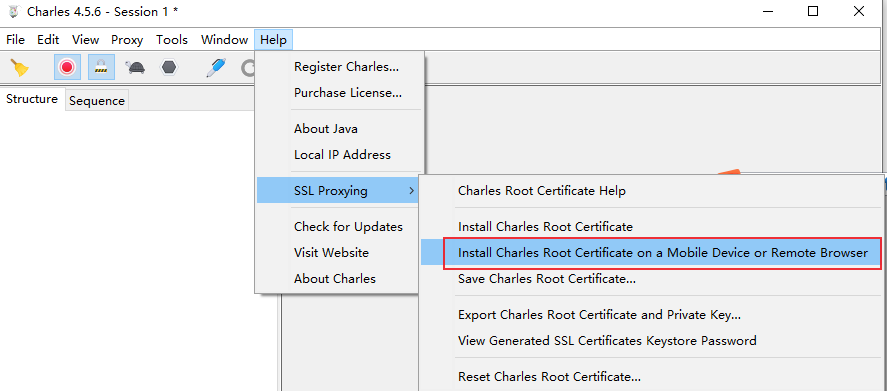 选择 “Help” -> “SSL Proxying” -> “Install Charles Root Certificate on a Mobile Device or Remote Browser”