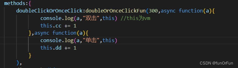 引入methods后,输入的函数this指向为当前组件实例,300毫秒是区分单击还是双击的时间间隔。