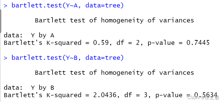 bartlett.test(Y~A, data=tree)