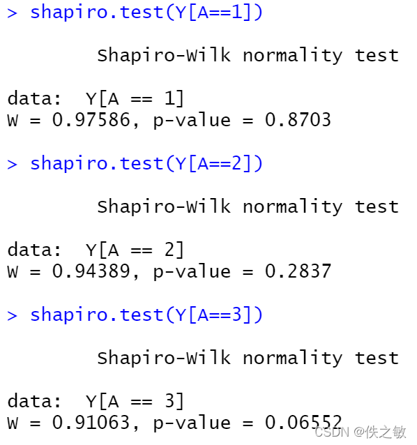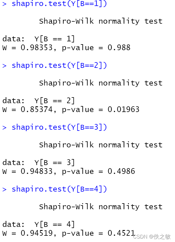 shapiro.test()为正态W检验方法,用于正态性检验。其使用格式为shapiro.test(x),其中x是由数据构成的向量。P值大于显著性水平认为样本来自正态分布。