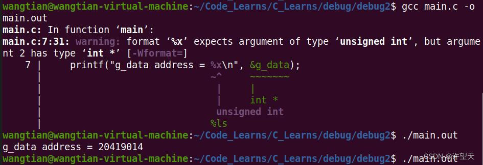 当默认进行 gcc 编译时,即只输入 gcc main.c -o main.out 命令。可以看出全局变量的地址每次运行不固定。如下所示: