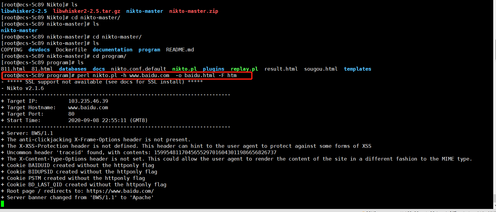 命令:perl nikto.pl -h www.baidu.com -o baidu.html -F htm