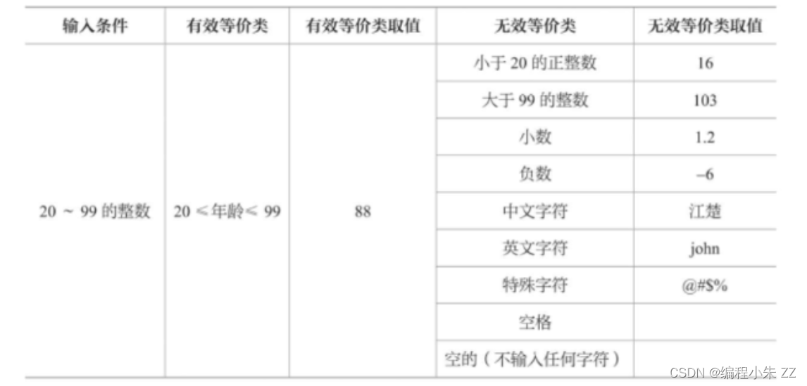 比如他给的条件就是 20 到99,那无效等价类就是对它这个条件取反。20 到 99 那取反就是小于20,是取反的情况。那 20 到 99 取反,大于99,就是区分的另一个情况。还有年龄肯定是一个整数,这个整数是属于有效等价类的,那无效等价肯定就取反就非整数。