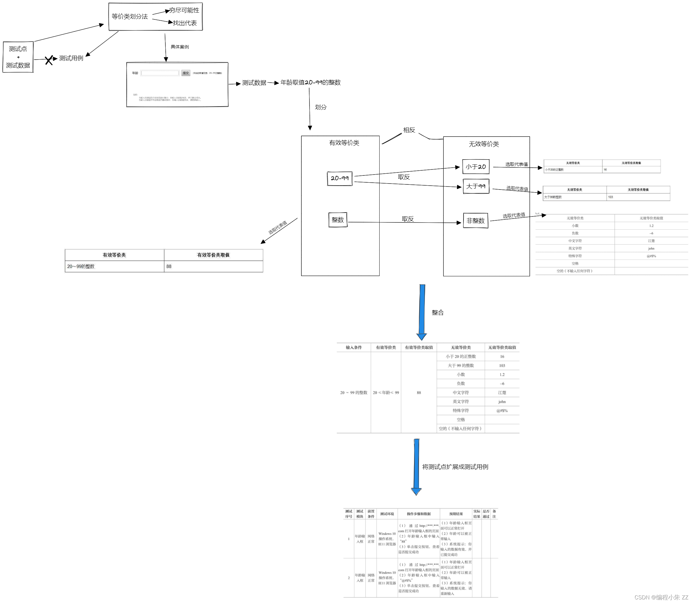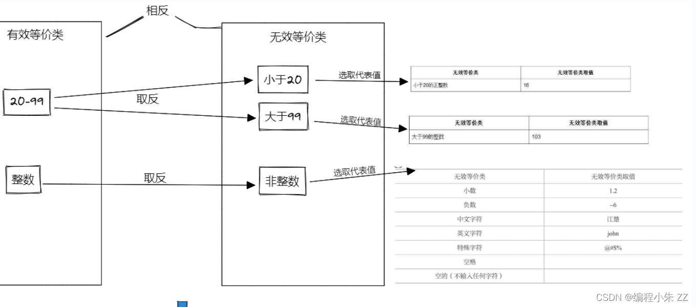 比如说 20 到 99 是输入条件,有效等价类就是 20 到 99 之间的年龄,反效值就取一个代表值,20 到 99 取反会有两种取反情况,就是小于 20 大于 99 这两种。而整数取反就是会有小数、负数、中文、英文、特殊字符这几种情况。