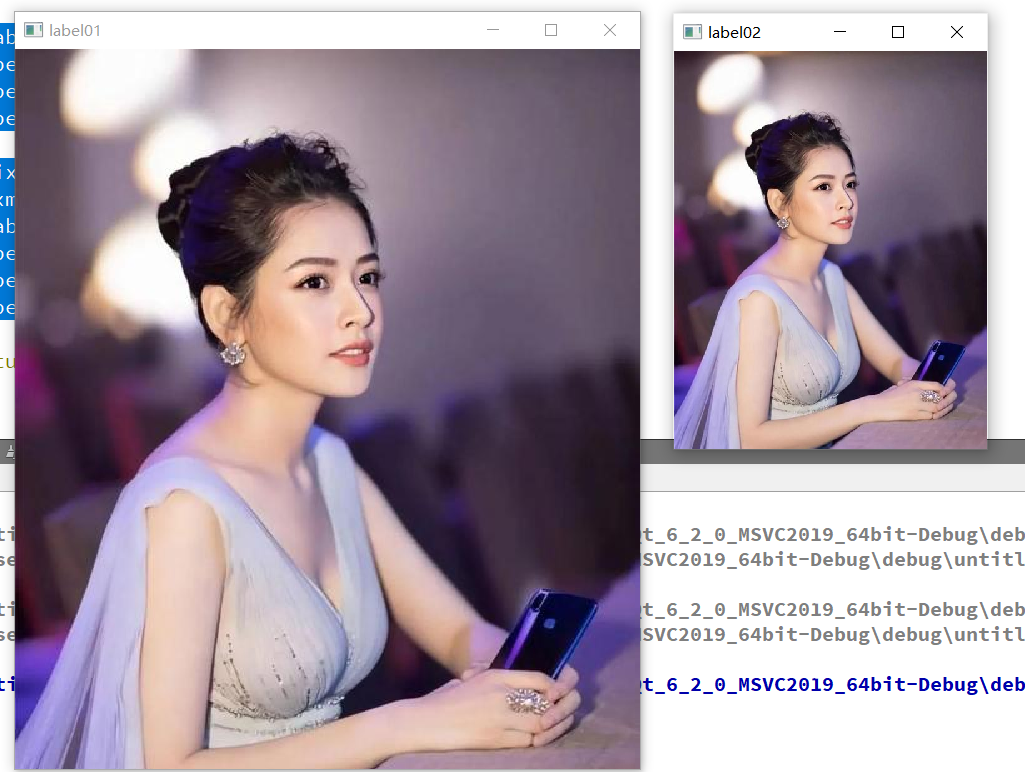 QPixmap pixmap("D://eee.jpg");QLabel label;label.setPixmap(pixmap);label.setWindowTitle("label01");label.show();QPixmap pixmap2 = pixmap;pixmap2.setDevicePixelRatio(2);QLabel label2;label2.setPixmap(pixmap2);label2.setWindowTitle("label02");label2.show();