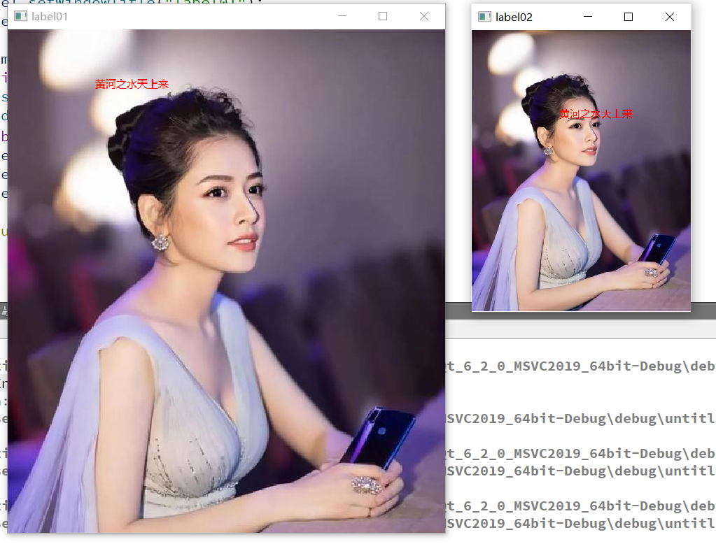 QPixmap pixmap("D://eee.jpg");QPixmap pixmap2 = pixmap;QPainter p1(&pixmap);p1.setPen(Qt::red);p1.drawText(100,100,"黄河之水天上来");QLabel label;label.setPixmap(pixmap);label.setWindowTitle("label01");label.show();pixmap2.setDevicePixelRatio(2);QPainter p2(&pixmap2);p2.setPen(Qt::red);p2.drawText(100,100,"黄河之水天上来");QLabel label2;label2.setPixmap(pixmap2);label2.setWindowTitle("label02");label2.show();