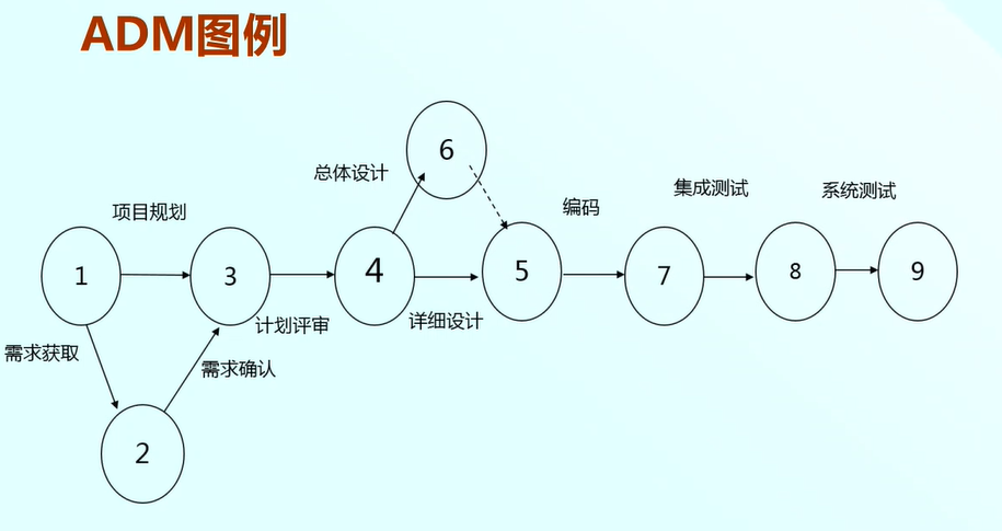 那么ADM网络图是有虚活动的,例如我们看ADM网络图当中,6——5之间虚线就是虚活动。那么虚活动不是一个真实的活动,就是为了表示逻辑关系,也不需要消耗资源的这么一个活动。