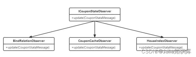 而状态更新后,C端房源索引数据/b端基础房源数据/缓存中的数据,这些数据的更新使用了观察者模式监听状态的变更,在观察者中通过发送mq异步来进行数据更新,类图如下所示: