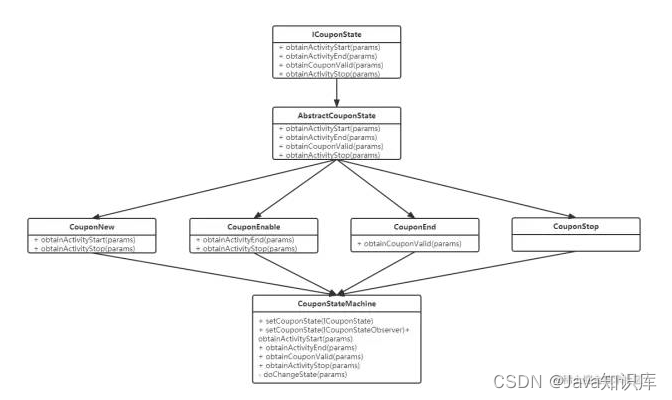 可以想到,在每个状态流转的时候,都有很多操作来做。为了保证业务逻辑清晰,状态流转我采用了状态模式来进行实现,类图如下所示:
