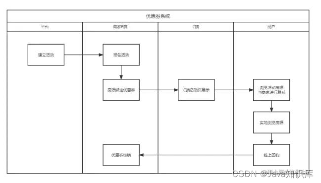 部门为一个租房房源平台,为各个商家提供房源发布&C端曝光获客的功能,现在要构建一个优惠券系统,用于各个节假日节点进行商家营销活动。形式主要以商家在B端参与活动,对房源绑定优惠券,将租赁价格进行优惠,来在C端吸引用户进行租房。
