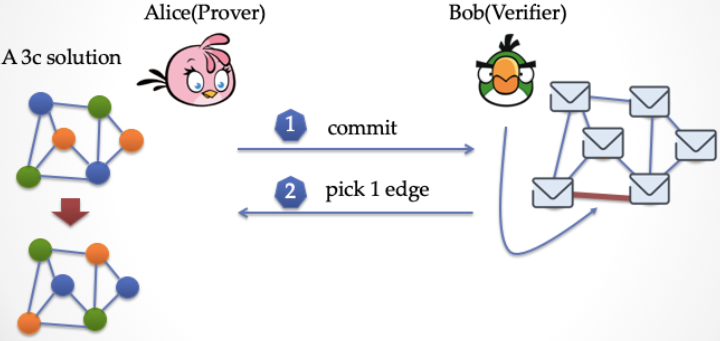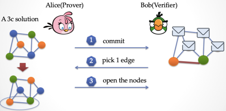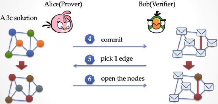 然后进入回应挑战阶段,假设 Bob 挑选的是最下面的一条边。Alice打开Bob指定的两个节点,作为对挑战的回应,让 Bob 检查,发现这两个顶点的颜色是不同的,那么 Bob 认为这次检验正确。但是Bob 只看到了图的局部,一次挑战不能让他信任,但是多次挑战可能让Bob获取到Alice全部的染色方案,极端情况就是Bob查看了所有边的相邻节点颜色,从而完全重构出染色方案。