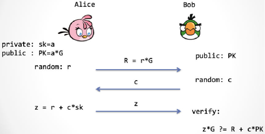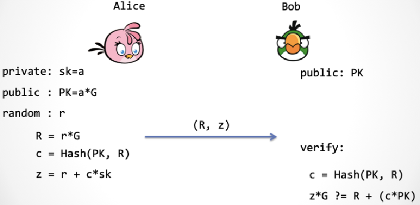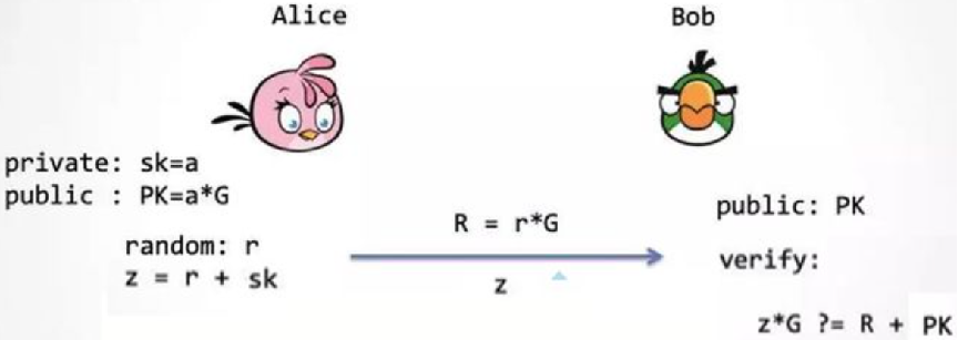 ·Alice:均匀随机选择r,并依次计算 R=r*G c=Hash(R,PK) z=r+c*sk