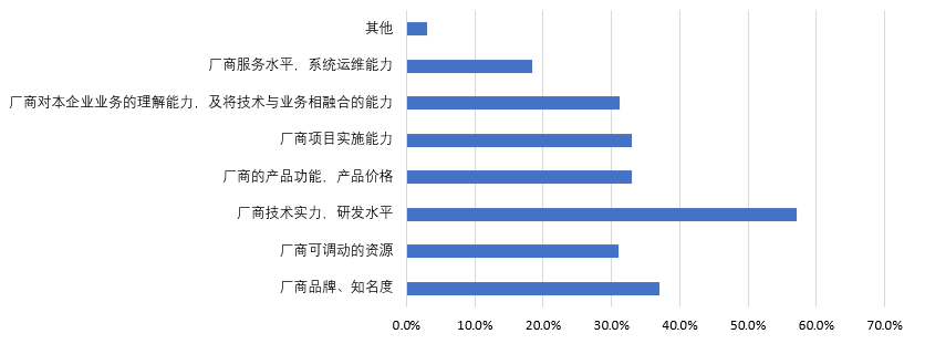 从调研数据来看,对于一家人工智能厂商用户最关注的还是其技术实力及研发水平,可见强大的技术是一张王牌;厂商的品牌知名度是用户考虑的一个重要因素,毕竟大家都说好的也不会差到哪去;要将人工智能技术进行应用落地,厂商对客户业务的理解、将技术与业务融合的能力,以及项目实施能力、产品性价比等方面,都是用户重要的考虑因素;此外,因为智能化转型往往需要多方面的资源支持才能打通整个业务乃至产业链条,所以厂商能否提供强有力的资源支持也是某些客户关注的。比如制造企业、零售企业需要人工智能解决方案,附带的一些电商、营销、物流方面的资源支持将会是重要的加分项。