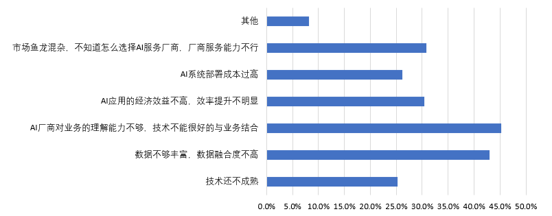从调研数据来看,人工智能应用推广的关键是如何将技术与业务进行深度融合,并打通数据服务,同时降低智能系统实施成本,为客户带来看得见的经济效益。同时,着力提升服务能力,优化用户体验也很重要。