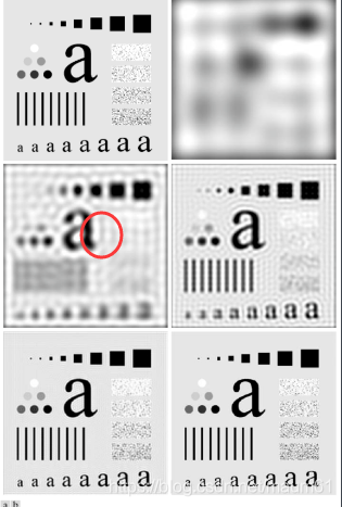 比较明显的是红色圈圈的地方,这种现象是发生在一张图像内灰度变化剧烈的地方,在使用大的量化步长后,图像的低频分量被完全保存,高频分量被完全移去,经过反变换后,会有很多类似于sinc函数那样的周期震荡在空间域内,因此会低通滤波器在模糊图像的同时,会将灰度剧烈变化的那些震荡铺满整个恢复的图像。