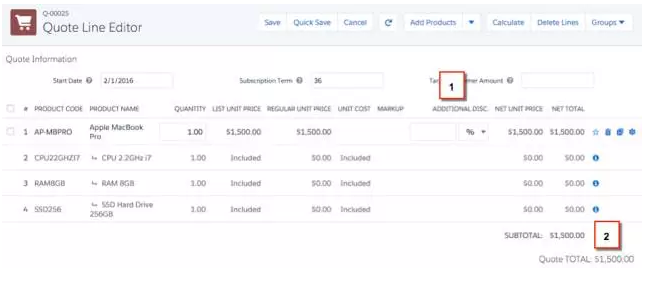 你必须能够确定销售产品的合适的价格,Salesforce的CPQ作为真实定价来源。你和你的销售代表可以在Salesforce的CPQ中设置任意的折扣[ 1 ],Salesforce将会处理其他的计算工作[ 2 ]。是的,Salesforce的CPQ帮助你自动计算结果。你专注于你的客户,而不是你的计算器。