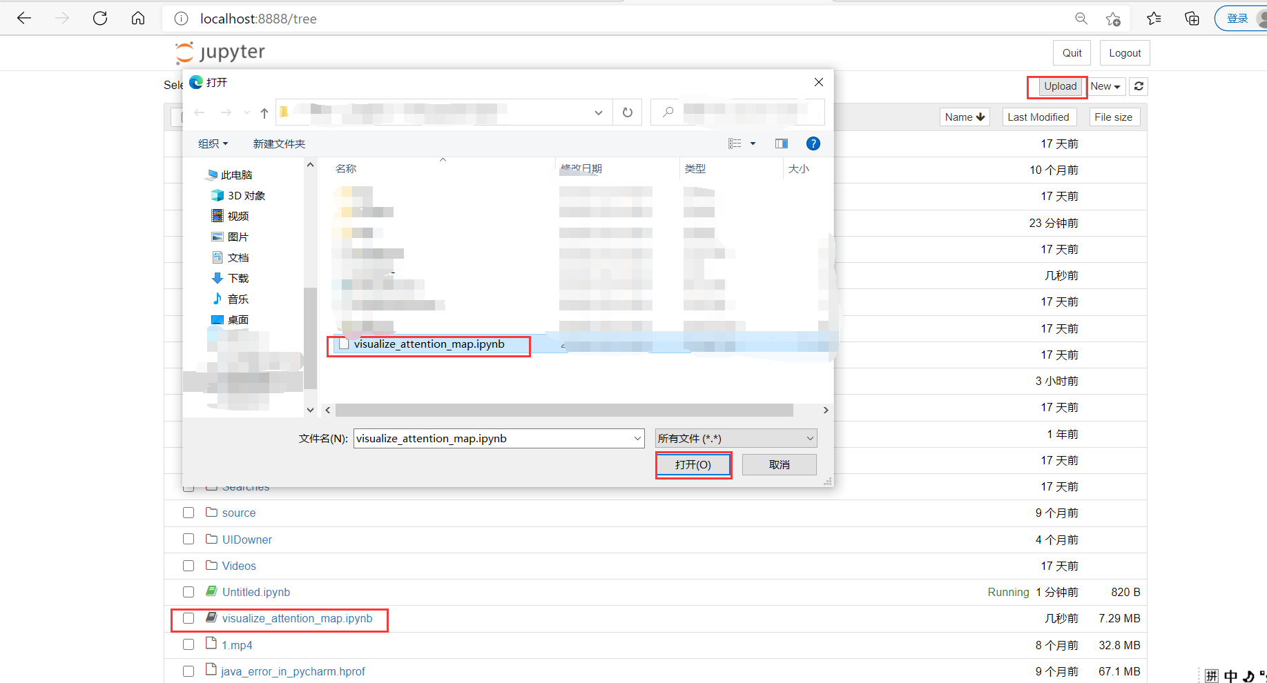 点击Jupyter Notebook打开后将在浏览器窗口上启动,我们只需要把需要打开的代码Upload上来就好了。