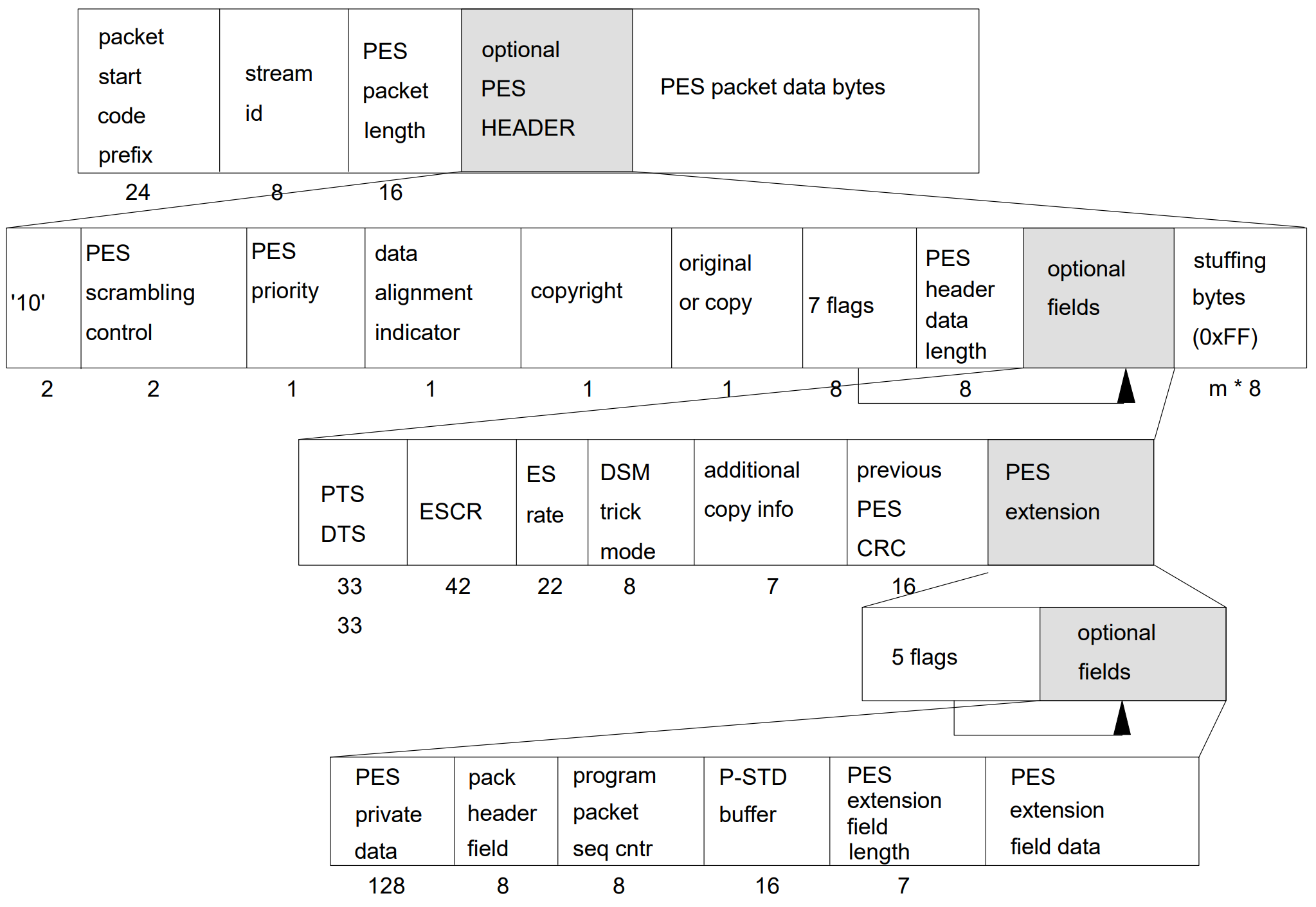 PES_packet() {packet_start_code_prefix 24 uimsbfstream_id 8 uimsbfPES_packet_length 16 uimsbfif( stream_id != program_stream_map&& stream_id != padding_stream&& stream_id != private_stream_2&& stream_id != ECM&& stream_id != EMM&& stream_id != program_stream_directory&& stream_id != DSMCC_stream&& stream_id != ITU-T Rec. H.222.1 type E_stream) {'10' 2 bslbfPES_scrambling_control 2 bslbfPES_priority 1 bslbfdata_alignment_indicator 1 bslbfcopyright 1 bslbforiginal_or_copy 1 bslbfPTS_DTS_flags 2 bslbfESCR_flag 1 bslbfES_rate_flag 1 bslbfDSM_trick_mode_flag 1 bslbfadditional_copy_info_flag 1 bslbfPES_CRC_flag 1 bslbfPES_extension_flag 1 bslbfPES_header_data_length 8 uimsbfif (PTS_DTS_flags =='10' ) {'0010' 4 bslbfPTS [32..30] 3 bslbfmarker_bit 1 bslbfPTS [29..15] 15 bslbfmarker_bit 1 bslbfPTS [14..0] 15 bslbfmarker_bit 1 bslbf}if (PTS_DTS_flags ==‘11’ ) {'0011' 4 bslbfPTS [32..30] 3 bslbfmarker_bit 1 bslbfPTS [29..15] 15 bslbfmarker_bit 1 bslbfPTS [14..0] 15 bslbfmarker_bit 1 bslbf'0001' 4 bslbfDTS [32..30] 3 bslbfmarker_bit 1 bslbfDTS [29..15] 15 bslbfmarker_bit 1 bslbfDTS [14..0] 15 bslbfmarker_bit 1 bslbf}if (ESCR_flag=='1') {reserved 2 bslbfESCR_base[32..30] 3 bslbfmarker_bit 1 bslbfESCR_base[29..15] 15 bslbfmarker_bit 1 bslbfESCR_base[14..0] 15 bslbfmarker_bit 1 bslbfESCR_extension 9 uimsbfmarker_bit 1 bslbf}if (ES_rate_flag == '1') {marker_bit 1 bslbfES_rate 22 uimsbfmarker_bit 1 bslbf}if (DSM_trick_mode_flag == '1') {trick_mode_control 3 uimsbfif ( trick_mode_control == fast_forward ) {field_id 2 bslbfintra_slice_refresh 1 bslbffrequency_truncation 2 bslbf} else if ( trick_mode_control == slow_motion ) {rep_cntrl 5 uimsbf} else if ( trick_mode_control == freeze_frame ) {field_id 2 uimsbfreserved 3 bslbf} else if ( trick_mode_control == fast_reverse ) {field_id 2 bslbfintra_slice_refresh 1 bslbffrequency_truncation 2 bslbf} else if ( trick_mode_control == slow_reverse ) {rep_cntrl 5 uimsbf} else {reserved 5 bslbf}}if ( additional_copy_info_flag == '1' ) {marker_bit 1 bslbfadditional_copy_info 7 bslbf}if ( PES_CRC_flag == '1' ) {previous_PES_packet_CRC 16 bslbf}if ( PES_extension_flag == '1' ) {PES_private_data_flag 1 bslbfpack_header_field_flag 1 bslbfprogram_packet_sequence_counter_flag 1 bslbfP-STD_buffer_flag 1 bslbfreserved 3 bslbfPES_extension_flag_2 1 bslbfif ( PES_private_data_flag == '1' ) {PES_private_data 128 bslbf}if (pack_header_field_flag == '1' ) {pack_field_length 8 uimsbfpack_header()}if(program_packet_sequence_counter_flag== '1'){marker_bit 1 bslbfprogram_packet_sequence_counter 7 uimsbfmarker_bit 1 bslbfMPEG1_MPEG2_identifier 1 bslbforiginal_stuff_length 6 uimsbf}if ( P-STD_buffer_flag == '1' ) {'01' 2 bslbfP-STD_buffer_scale 1 bslbfP-STD_buffer_size 13 uimsbf}if ( PES_extension_flag_2 == '1'){marker_bit 1 bslbfPES_extension_field_length 7 uimsbffor(i=0;i<PES_extension_field_length;i++) {reserved 8 bslbf}}}for (i=0;i<N1;i++) {stuffing_byte 8 bslbf}for (i=0;i<N2;i++) {PES_packet_data_byte 8 bslbf}} else if ( stream_id == program_stream_map|| stream_id == private_stream_2|| stream_id == ECM|| stream_id == EMM|| stream_id == program_stream_directory|| stream_id == DSMCC_stream)|| stream_id == ITU-T Rec. H.222.1 type E stream {for ( i=0;i<PES_packet_length;i++) {PES_packet_data_byte 8 bslbf}} else if ( stream_id == padding_stream) {for ( i=0;i<PES_packet_length;i++) {padding_byte 8 bslbf}}