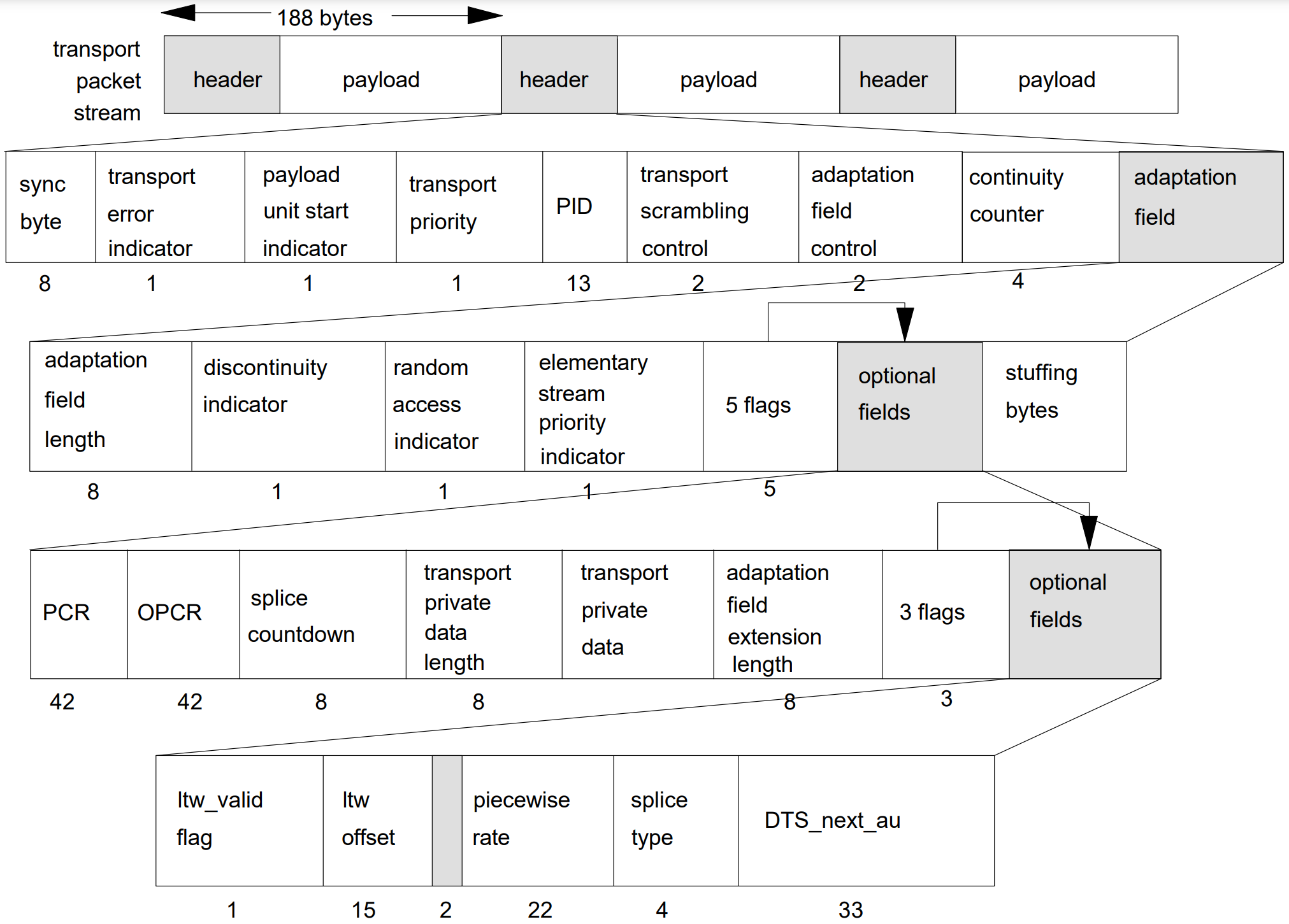 adaptation_field() {adaptation_field_length 8 uimsbfif(adaptation_field_length >0) {discontinuity_indicator 1 bslbfrandom_access_indicator 1 bslbfelementary_stream_priority_indicator 1 bslbfPCR_flag 1 bslbfOPCR_flag 1 bslbfsplicing_point_flag 1 bslbftransport_private_data_flag 1 bslbfadaptation_field_extension_flag 1 bslbfif(PCR_flag == '1') {program_clock_reference_base 33 uimsbfreserved 6 bslbfprogram_clock_reference_extension 9 uimsbf}if(OPCR_flag == '1') {original_program_clock_reference_base 33 uimsbfreserved 6 bslbforiginal_program_clock_reference_extension 9 uimsbf}if (splicing_point_flag == '1') {splice_countdown 8 tcimsbf}if(transport_private_data_flag == '1') {transport_private_data_length 8 uimsbffor (i=0; i<transport_private_data_length;i++){private_data_byte 8 bslbf}}if (adaptation_field_extension_flag == '1' ) {adaptation_field_extension_length 8 uimsbfltw_flag 1 bslbfpiecewise_rate_flag 1 bslbfseamless_splice_flag 1 bslbfreserved 5 bslbfif (ltw_flag == '1') {ltw_valid_flag 1 bslbfltw_offset 15 uimsbf}if (piecewise_rate_flag == '1') {reserved 2 bslbfpiecewise_rate 22 uimsbf}if (seamless_splice_flag == '1'){splice_type 4 bslbfDTS_next_AU[32..30] 3 bslbfmarker_bit 1 bslbfDTS_next_AU[29..15] 15 bslbfmarker_bit 1 bslbfDTS_next_AU[14..0] 15 bslbfmarker_bit 1 bslbf}for ( i=0;i<N;i++) {reserved 8 bslbf}}for (i=0;i<N;i++){stuffing_byte 8 bslbf}}