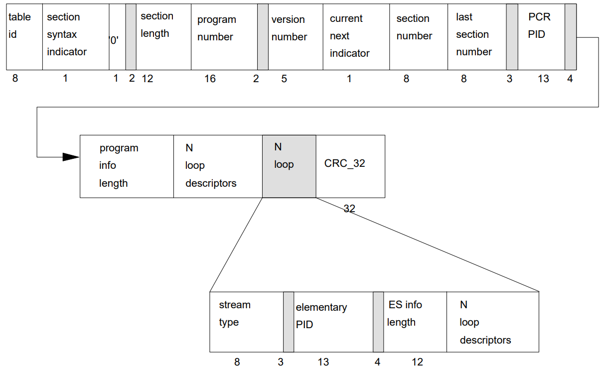TS_program_map_section() {table_id 8 uimsbfsection_syntax_indicator 1 bslbf'0' 1 bslbfreserved 2 bslbfsection_length 12 uimsbfprogram_number 16 uimsbfreserved 2 bslbfversion_number 5 uimsbfcurrent_next_indicator 1 bslbfsection_number 8 uimsbflast_section_number 8 uimsbfreserved 3 bslbfPCR_PID 13 uimsbfreserved 4 bslbfprogram_info_length 12 uimsbffor (i=0; i<N; i++) {descriptor()}for (i=0;i<N1;i++) {stream_type 8 uimsbfreserved 3 bslbfelementary_PID 13 uimsnfreserved 4 bslbfES_info_length 12 uimsbffor (i=0; i<N2; i++) {descriptor()}}CRC_32 32 rpchof