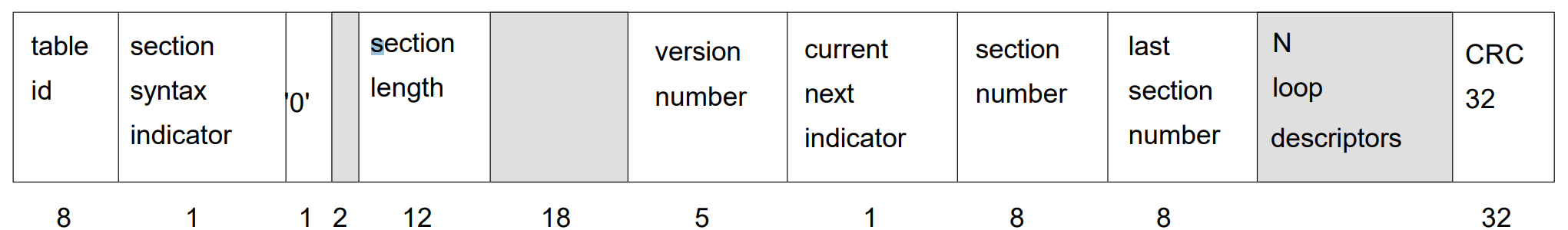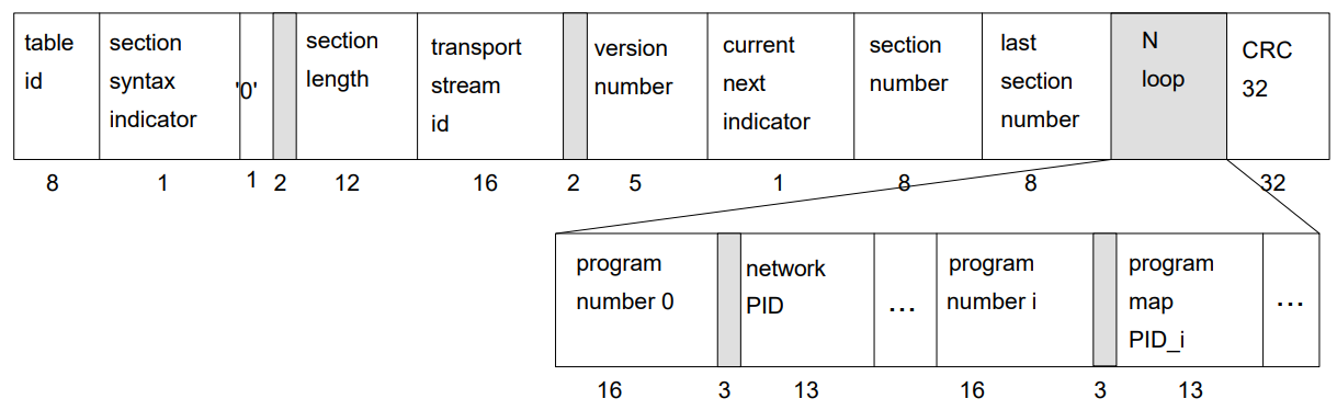 program_association_section() {table_id 8 uimsbfsection_syntax_indicator 1 bslbf'0' 1 bslbfreserved 2 bslbfsection_length 12 uimsbftransport_stream_id 16 uimsbfreserved 2 bslbfversion_number 5 uimsbfcurrent_next_indicator 1 bslbfsection_number 8 uimsbflast_section_number 8 uimsbffor (i=0; i<N;i++) {program_number 16 uimsbfreserved 3 bslbfif(program_number == '0') {network_PID 13 uimsbf} else {program_map_PID 13 uimsbf}}CRC_32 32 rpchof