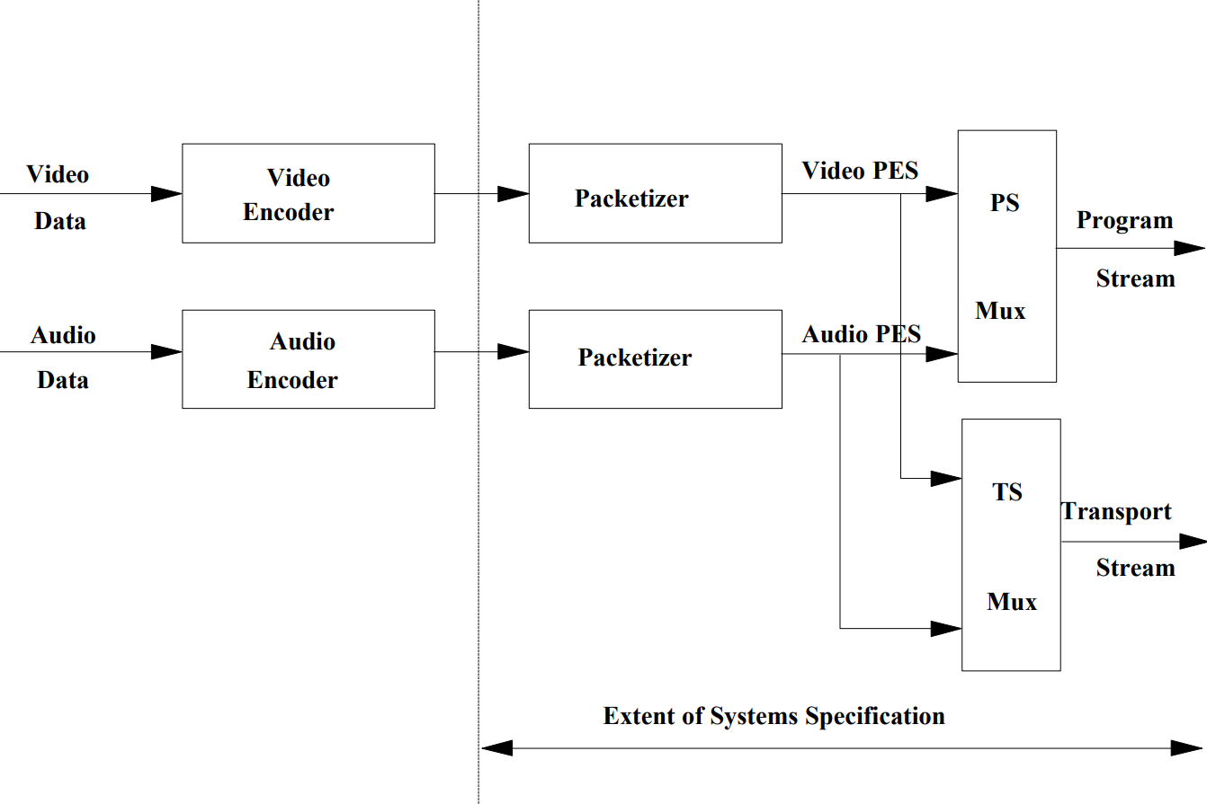 MPEG-2是MPEG(Moving Picture Experts Group,运动图像专家组)组织制定的视频和音频有损压缩标准之一,它的正式名称为“基于数字存储媒体运动图像和语音的压缩标准”。MPEG-2标准是在1994年11月为数字电视而提出来的,目前分为9个部分,统称为ISO/IEC13818国际标准。其中第一部分ISO/IEC13818-1是系统(System)部分,该部分解决了将一个或多个基本视频流、音频流以及其他数据流合并成适合存储或传输的单个或多个流的问题。如下图为ISO/IEC13818-1标准中的原图,该系统(System)部分主要描述的是图中竖线右侧的相关内容,而图中左侧视频数据、音频数据的编码压缩分别遵循ISO/IEC 13818-2和ISO/IEC 13818-3中的规范,它们属于该标准的压缩层。