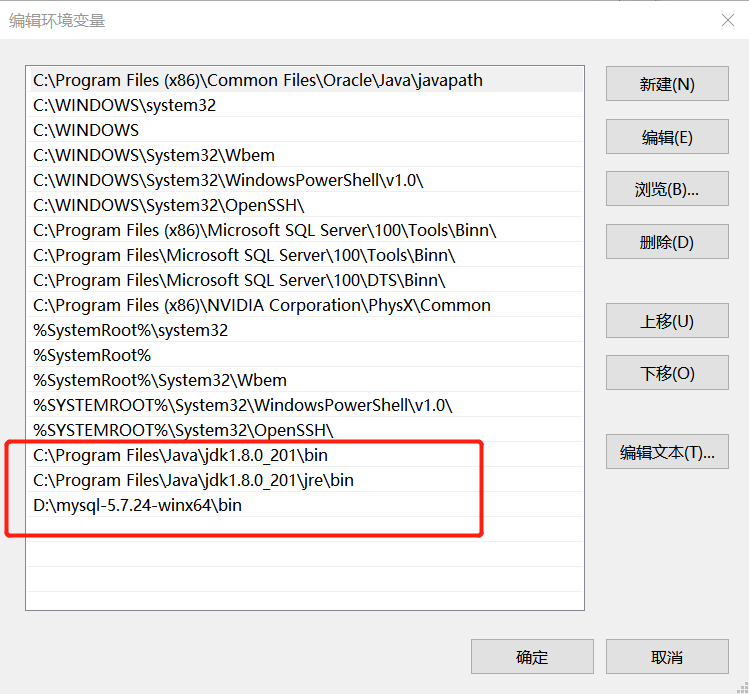 安装完成后最重要的是配置环境变量。先找到安装的bin目录以及jdk下的bin安装目录,复制一个路径。随后右键我的电脑点击属性,左侧进入高级系统设置。点击环境变量。选中下方系统变量框内的Path,点击编辑。最后点击新建环境变量,将路径复制到该框中,点击确定。然后复制另一个目录的的路径,将其添加到到环境变量中,完成环境配置。