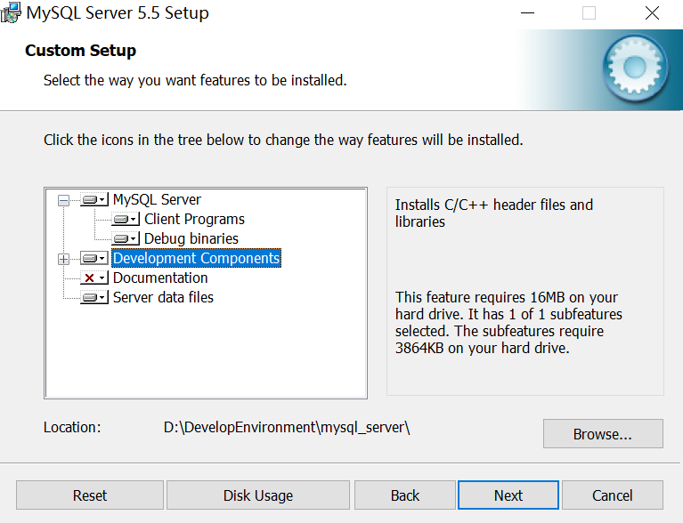 然后我们选中安装的服务类型development components,并且选择安装目录(一定要是英文目录),然后next