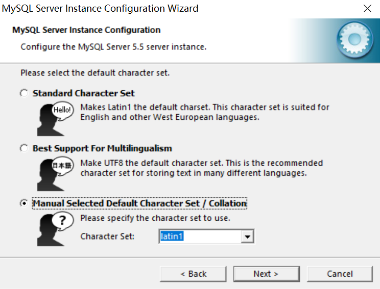 我们需要设置数据库的字符集,这就是中文乱码的源头,我们应该点击第三个 manual selected default character set,把字符集设置成UTF8,这是一个支持中文的字符集,然后点击next