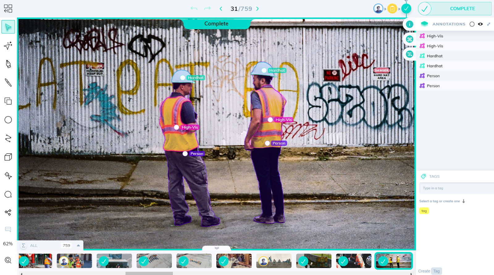 以下是我们如何在不到一分钟的时间内使用 V7 的自动注释工具标记工人 PPE。