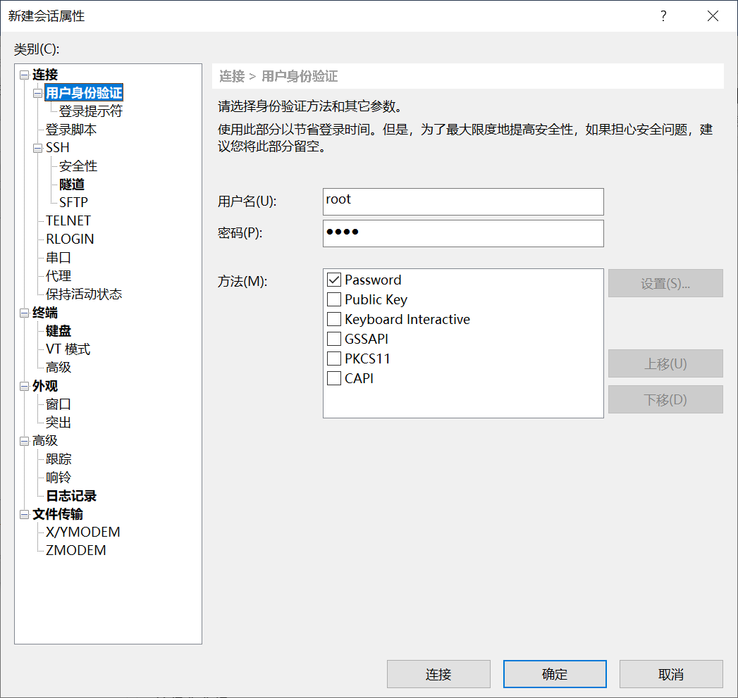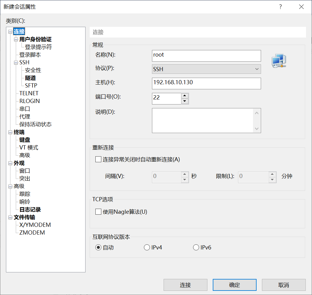 - 弹出“新建会话属性”,填写【名称】(一般是主机名)和【主机】(主机对应的IP地址),再点击【用户身份验证】,输入【用户名】和【密码】(这里我直接用root用户连接,也可以用普通用户连接),点击【确定】