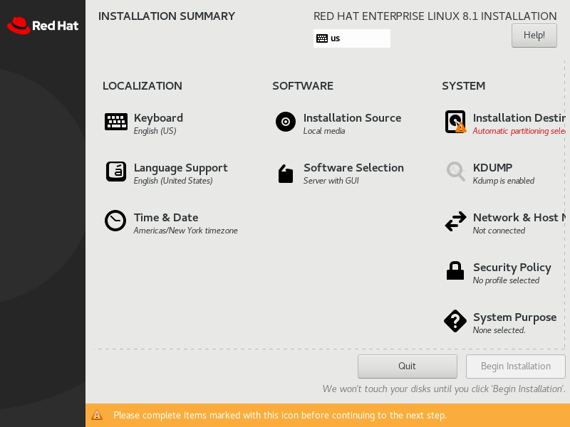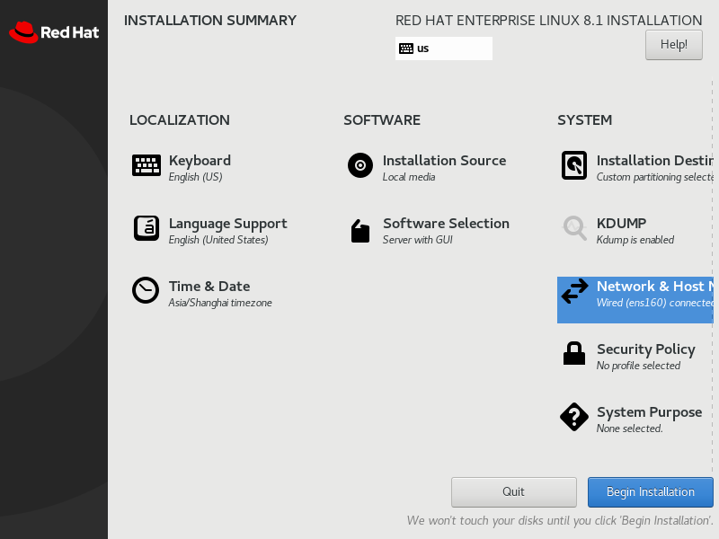 - Keyboard——键盘;Language Support——语言支持;Time & Date——时间和日期;Installation Source——安装源;Software Selection——软件选择;Installation Destination——安装位置;Network & Host name——网络和主机名;Security Policy——安全策略;System Purpose——系统目的;KDUMP——一个系统崩溃时收集信息的工具,如果系统用于练习则不需要开启。