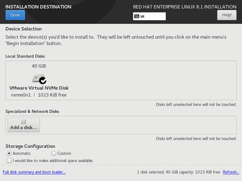 - 【安装源】默认为光盘,无需修改;【软件选择】默认为【Server with GUI(带有图形化界面)】(软件有很多种,老手可自行选择,新手直接确定即可)。【安装位置】选中【custom】,点击【Done】