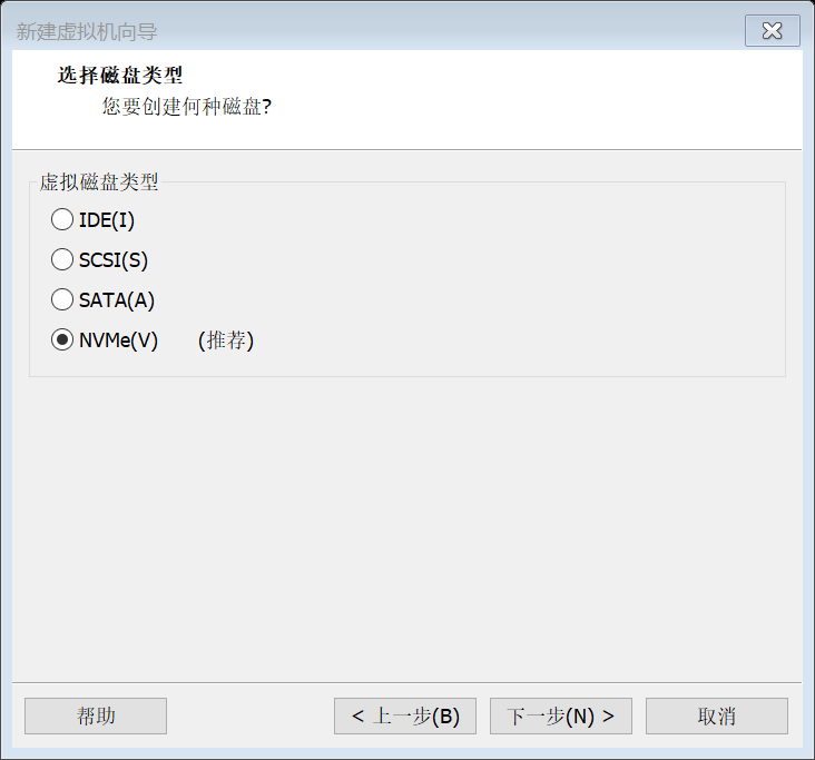 - 选择【虚拟磁盘类型】,默认即可(NVMe类似于固态硬盘),点击下一步