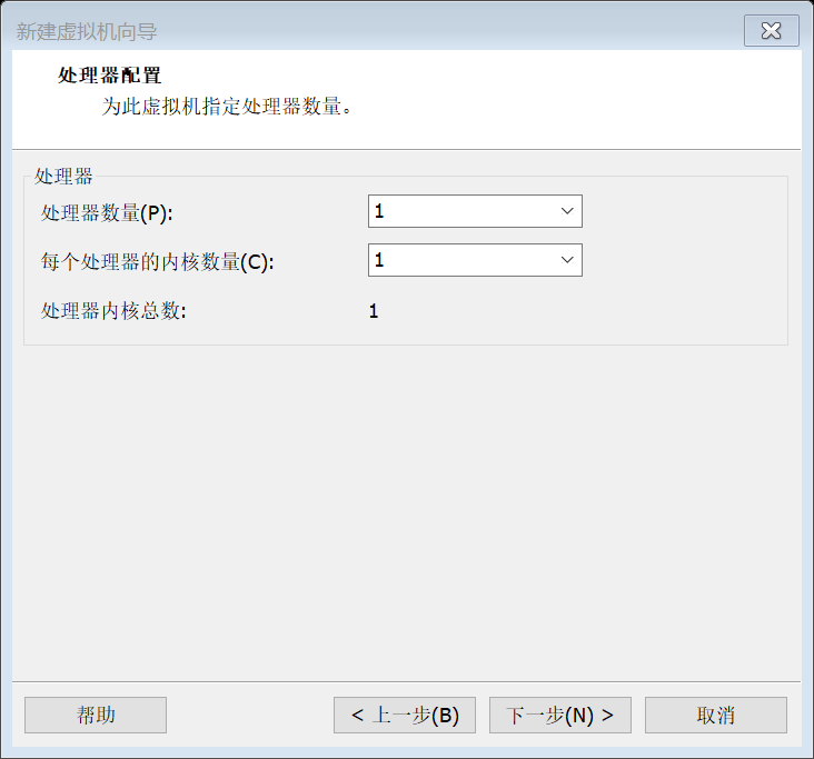 - 可选择合适的【处理器数量】与【内核数量】(内核总数越多,虚拟机运行速度越快),这里我设置为【1、1】,点击下一步