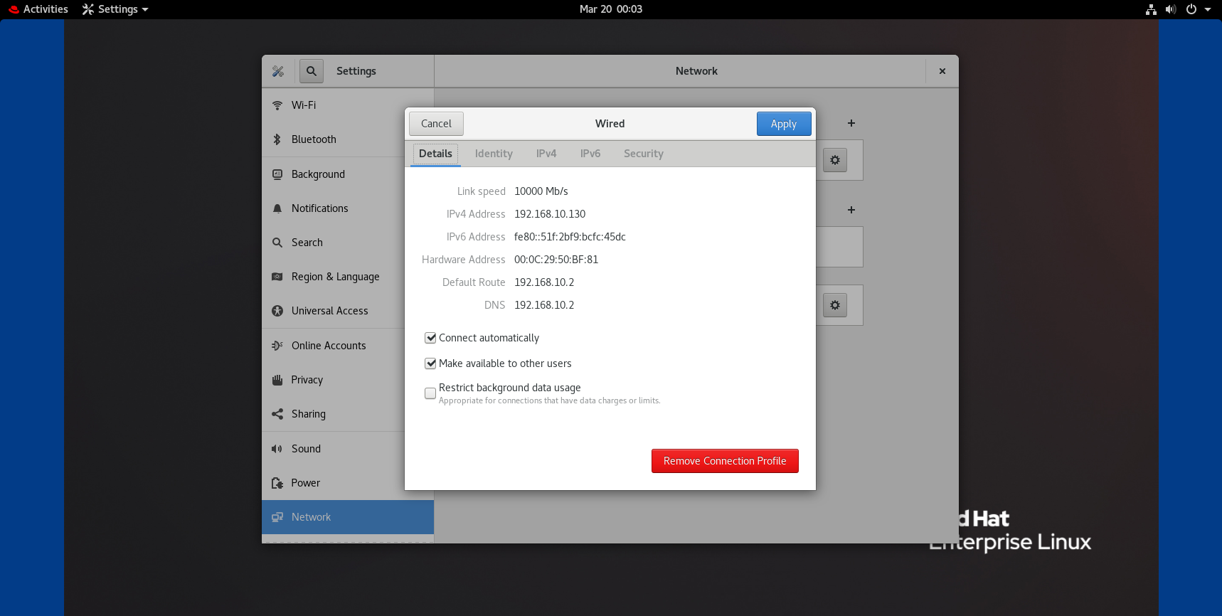 {注意:在④中,需要提前到Linux系统中查看IP地址,如下图所示,点击左上角的【Activities】,在左侧出现左下角棋盘样的图标,点击后出现Settings,点击【Settings】,在Network中点击Wired——connected右侧的设置按钮,即可看到IP地址}