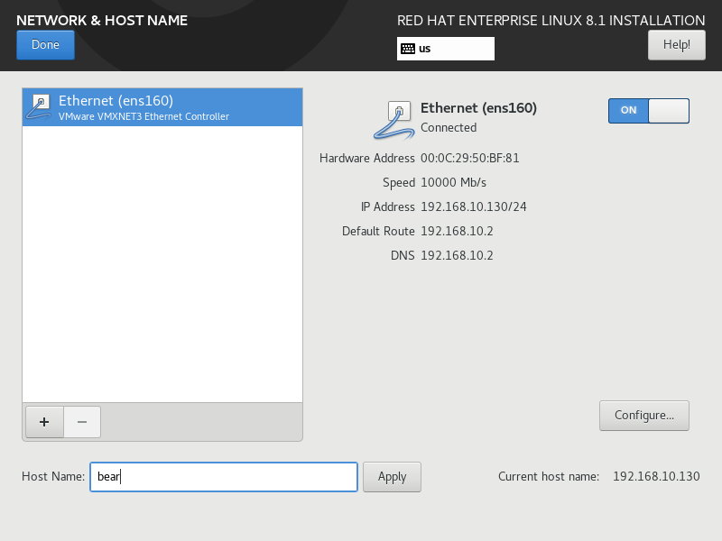 - 点击【网络和主机名】,将Ethernet改成【on】,可以设置自己喜欢的主机名,点击【Done】(⚠这步很重要,不改成on,后面会出现有虚拟网卡但是没有IP的情况!)