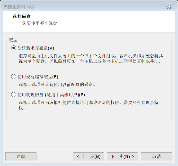 - 选择【磁盘】,建议使用【创建新虚拟磁盘】(如现有虚拟磁盘也可以选择使用现有虚拟磁盘,不建议直接使用物理磁盘),点击下一步
