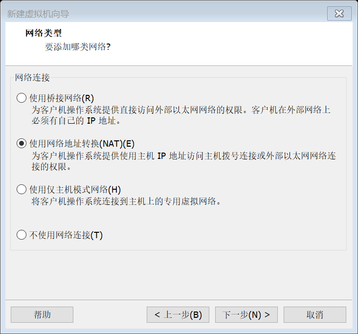 - 【网络连接】依据个人需要选择,这里我选择【使用网络地址转换】,点击下一步