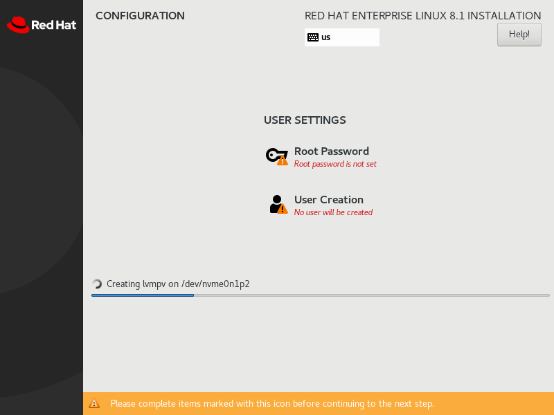 - Root Password——设置Root用户密码;User Creation——新建一个普通用户。安装过程中,需要设置Root用户密码【Root Password】,并创建一个普通用户【User creation】