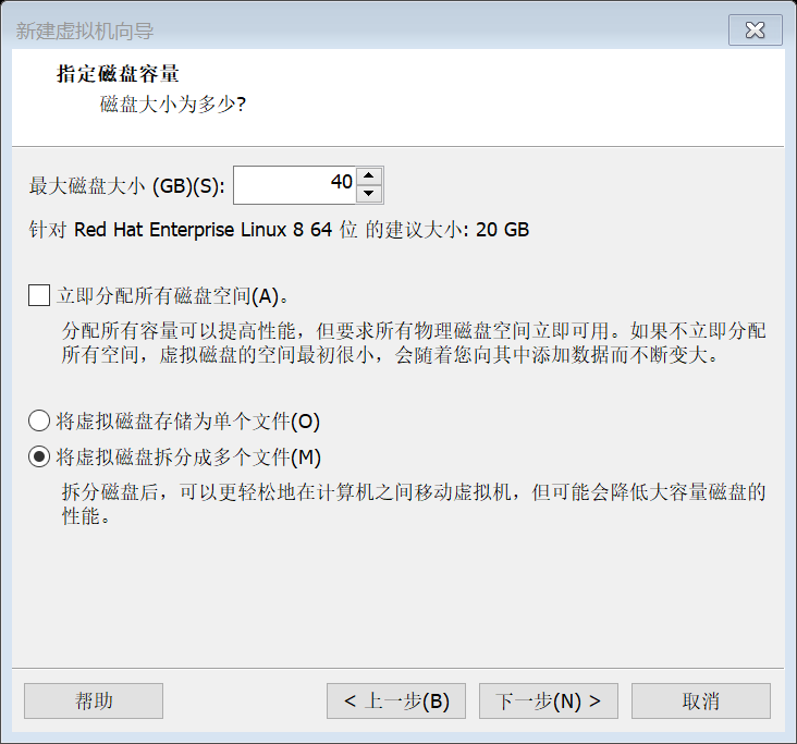 - 设置【最大磁盘大小】,这里我设置【40GB】,其他保持默认,点击下一步